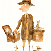 This turntable presents a full rotational study of the pet salesman, exploring his silhouette, clothing details, and exaggerated proportions. Designed in a warm, hand-drawn picture-book style and generated using a mix of traditional illustration techniques and AI-assisted workflows.